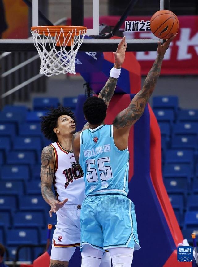 1月15日,青岛崂山啤酒队球员米奇(右)与吉林长白山恩都里队球员威尔逊在比赛中拼抢。新华社记者 李紫恒 摄